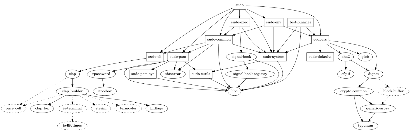 After announcing the plan to rewrite sudo in Rust, one of the pieces of feedback we read online most was our overreliance on external dependencies, making it harder to validate the correctness of the code. At that time we were already working on reducing our reliance on external dependencies, and those voices confirmed that we were on the right track. While that meant looking critically at our dependencies, it did not mean removing them just for the sake of it. We constantly weighed the pros and cons of each dependency. However, in the end, a lot of the functionality in sudo-rs is of such a special case that we opted to remove all but the most essential crates.